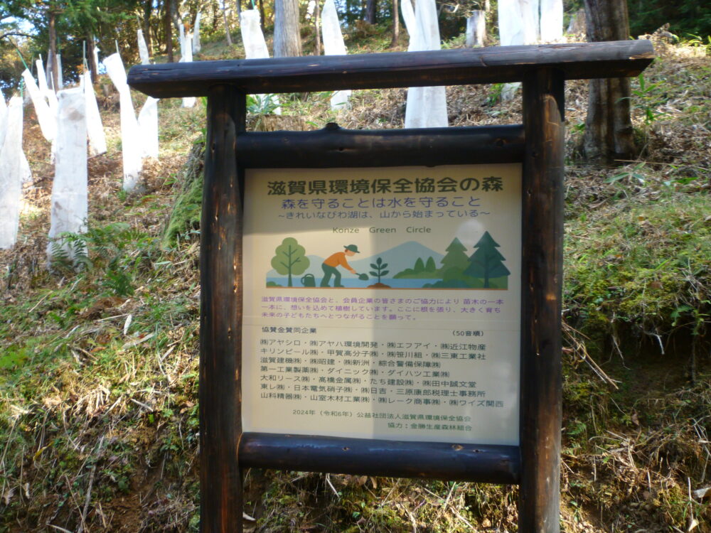そしてこの度、2年かけての植樹を終え、この取り組みに協賛いただいた当協会の会員事業所の皆さまの名を記した看板『滋賀県環境保全協会の森』を設置。看板には「苗木の一本一本に、想いを込めて植樹しています。ここに根を張り、大きく育ち未来の子どもたちへとつながることを願って」という言葉が表現されています。